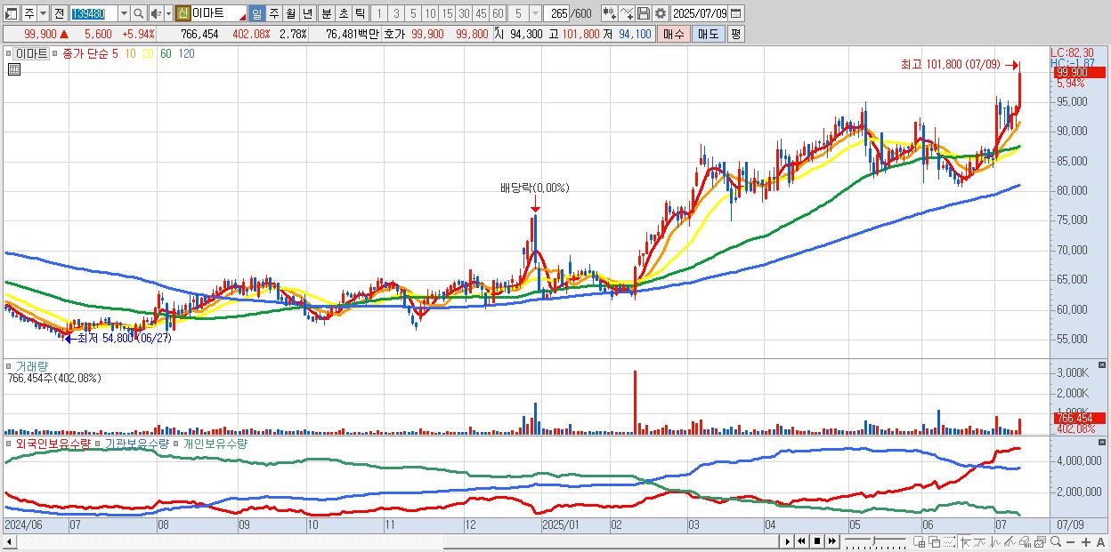 - 이마트 (99,300원 ▲ 5.3% , 시총: 27,403억, 외국인 순매수 거래금:135억)