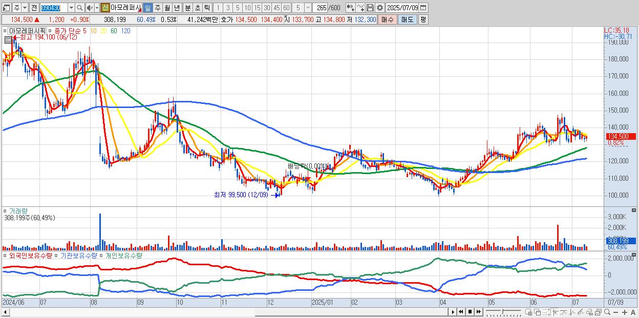 - 아모레퍼시픽 (134,700원 ▲ 1.05% , 시총: 78,790억, 외국인 순매수 거래금:124억)