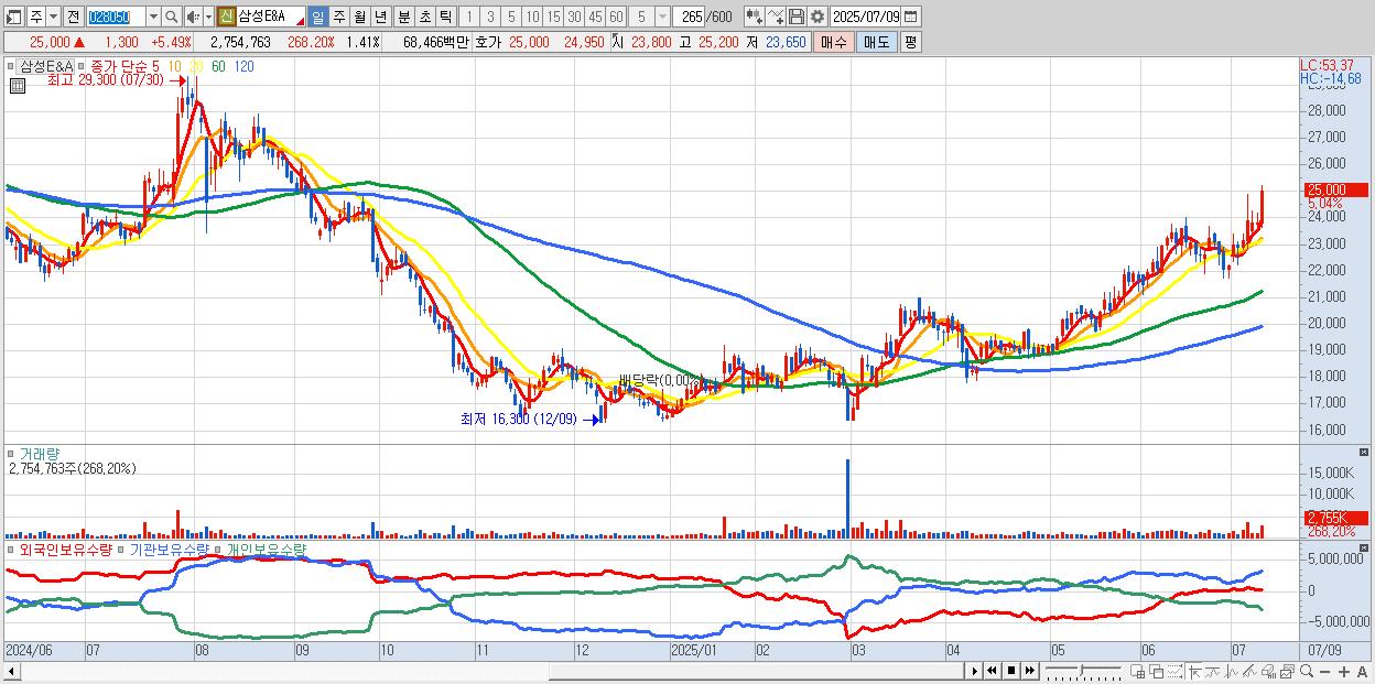 - 삼성E&A (25,000원 ▲ 5.49% , 시총: 49,000억, 외국인 순매수 거래금:109억)