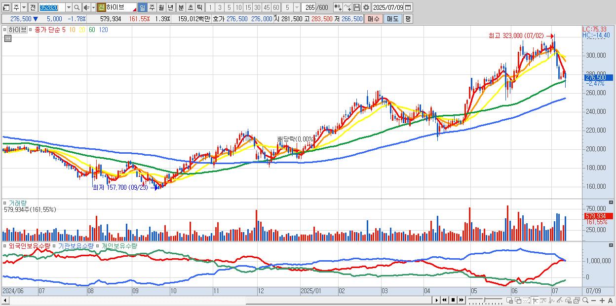 - 하이브 (277,000원 ▼ -1.6% , 시총: 115,376억, 외국인 순매수 거래금:146억)