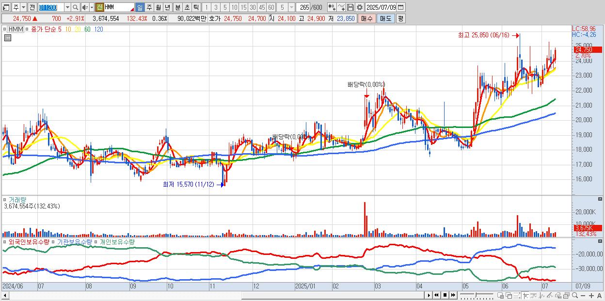- HMM (24,750원 ▲ 2.91% , 시총: 253,697억, 외국인 순매수 거래금:114억)