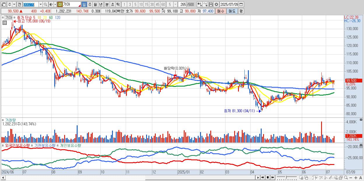 - 기아 (99,600원 ▲ 0.5% , 시총: 396,082억, 외국인 순매수 거래금:158억)