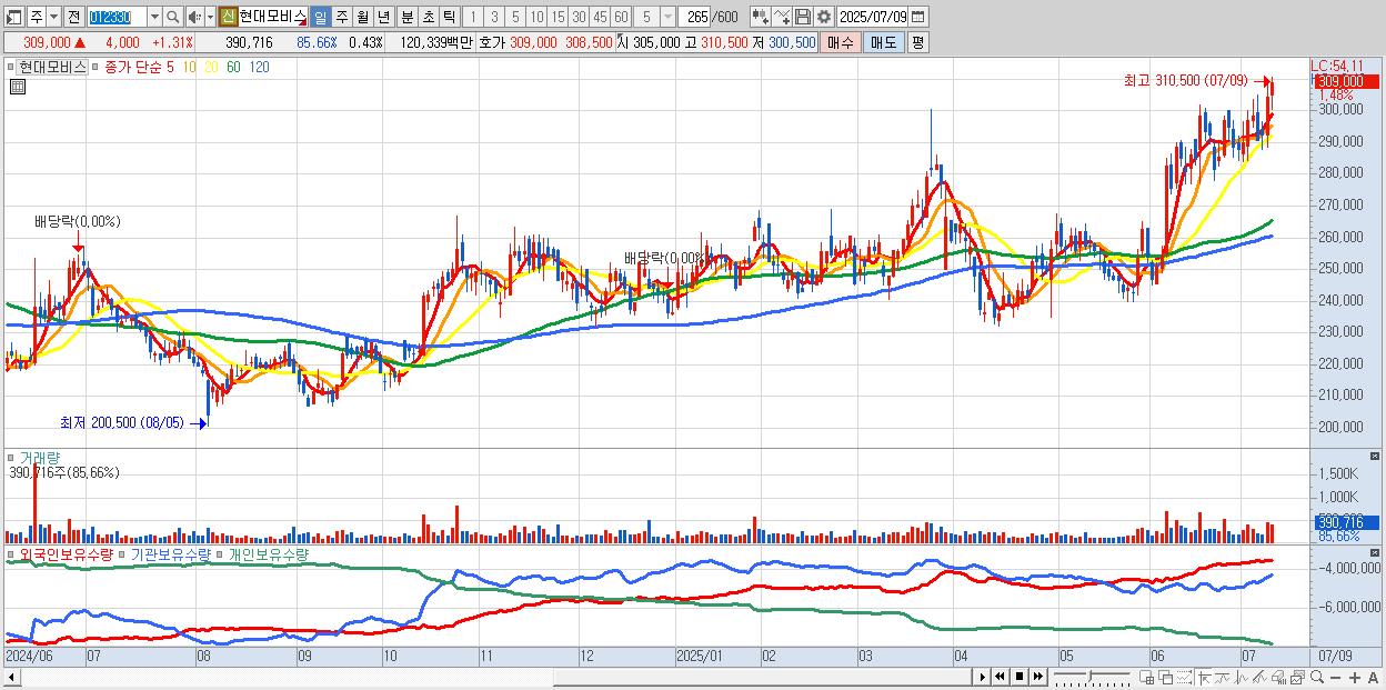 - 현대모비스 (309,500원 ▲ 1.48% , 시총: 284,106억, 외국인 순매수 거래금:138억)