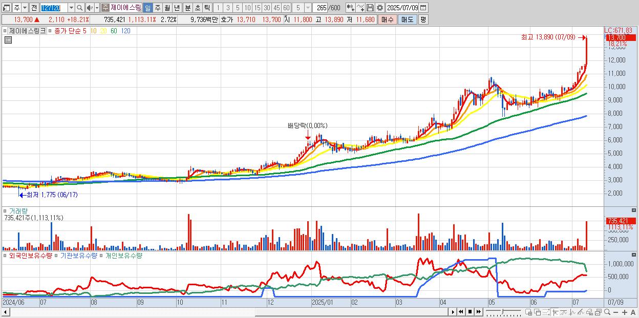 - 제이에스링크 (13,700원 ▲ 18.21% , 시총: 3,708억, 거래량: 735,421, 거래대금:97억, KOSDAQ)