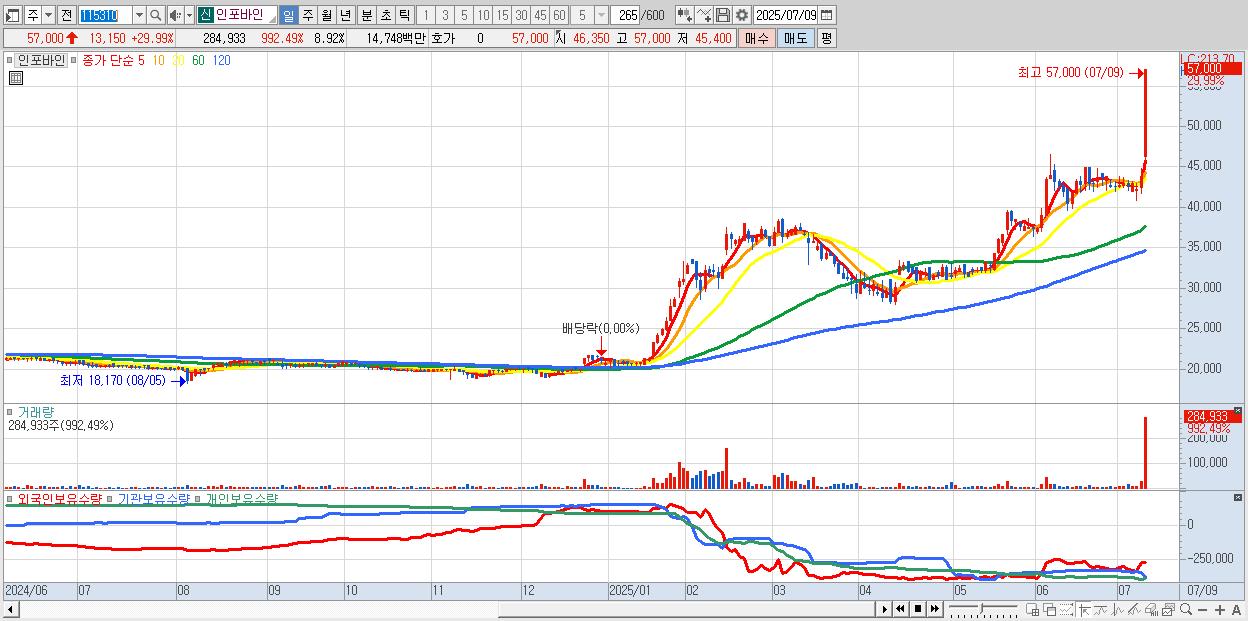- 인포바인 (57,000원 ▲ 29.99% , 시총: 1,820억, 거래량: 284,933, 거래대금:147억, KOSDAQ)