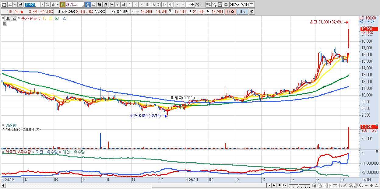 - 매커스 (19,790원 ▲ 22.09% , 시총: 3,199억, 거래량: 4,498,356, 거래대금:878억, KOSDAQ)