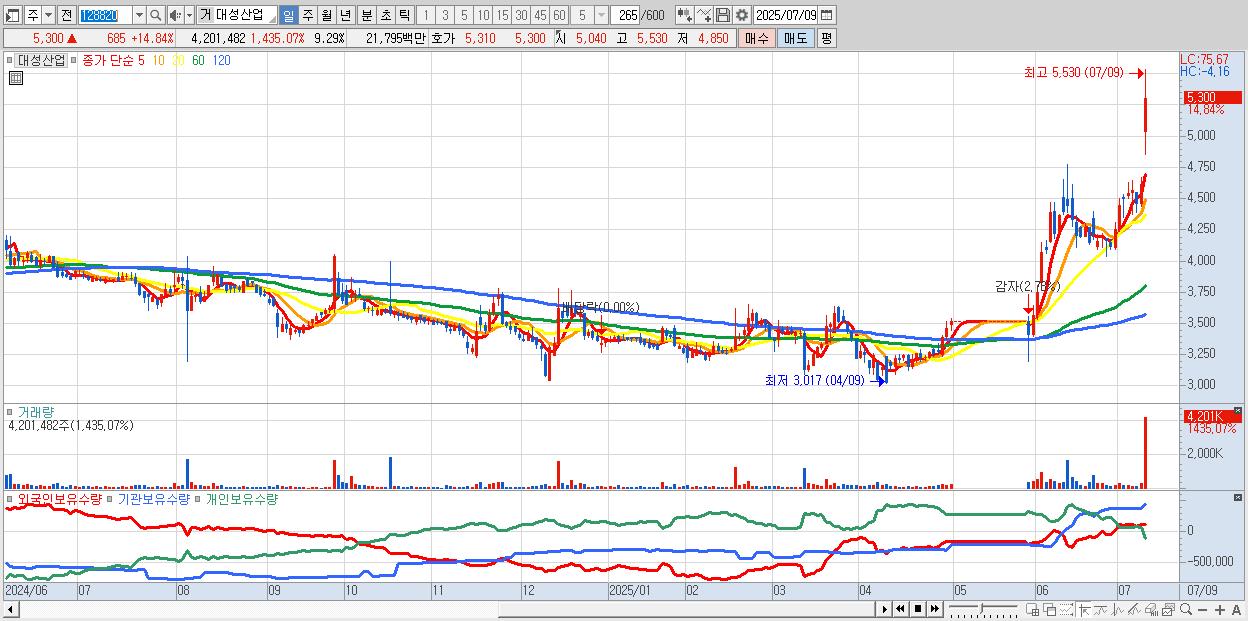 - 대성산업 (5,300원 ▲ 14.84% , 시총: 2,397억, 거래량: 4,201,482, 거래대금:218억, KOSPI)