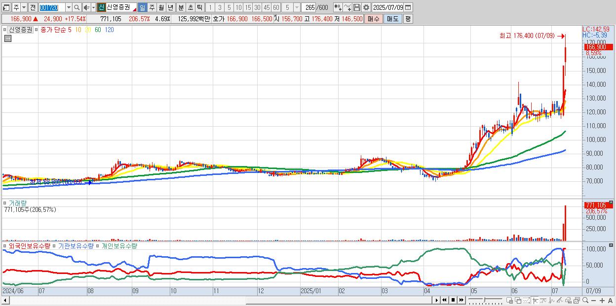 - 신영증권 (166,400원 ▲ 17.18% , 시총: 27,356억, 거래량: 414,238, 거래대금:675억, KOSPI)