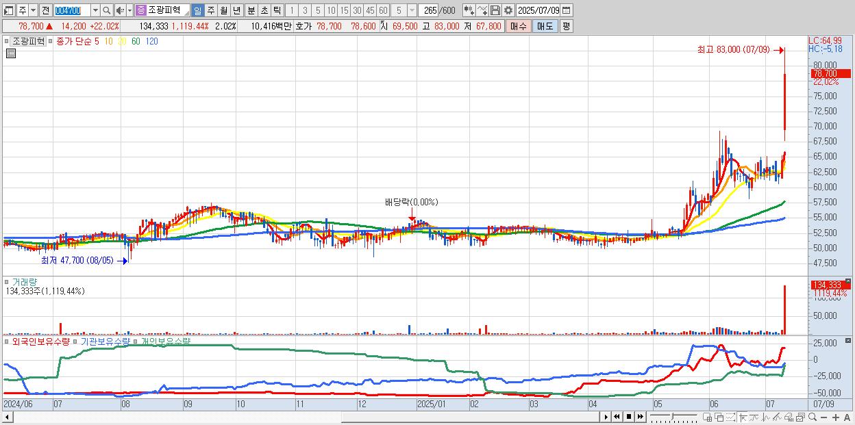 - 조광피혁 (78,700원 ▲ 22.02% , 시총: 5,233억, 거래량: 134,333, 거래대금:104억, KOSPI)