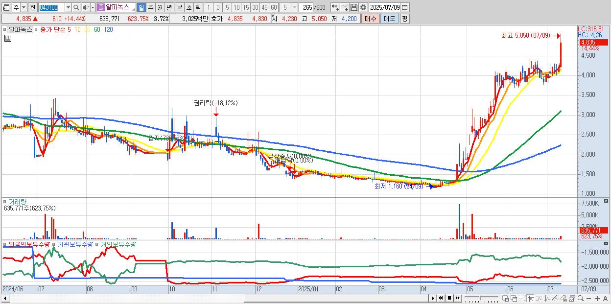 - 알파녹스 (4,835원 ▲ 14.44% , 시총: 827억, 거래량: 635,771, 거래대금:30억, KOSDAQ)
