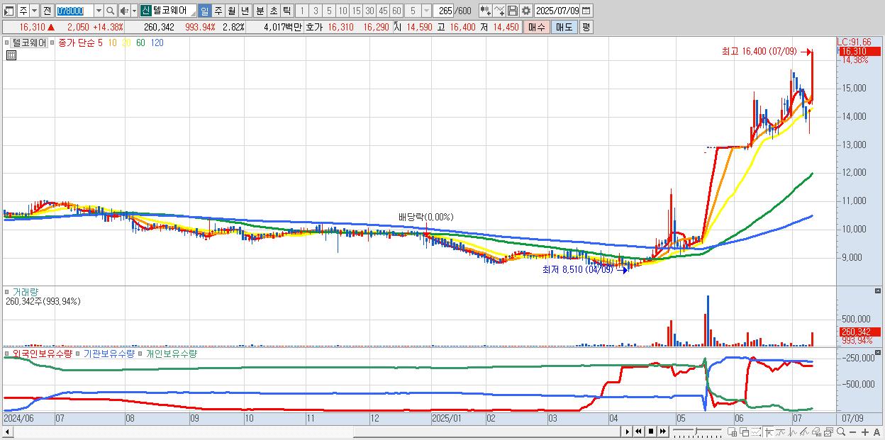 - 텔코웨어 (16,310원 ▲ 14.38% , 시총: 1,507억, 거래량: 260,342, 거래대금:40억, KOSPI)