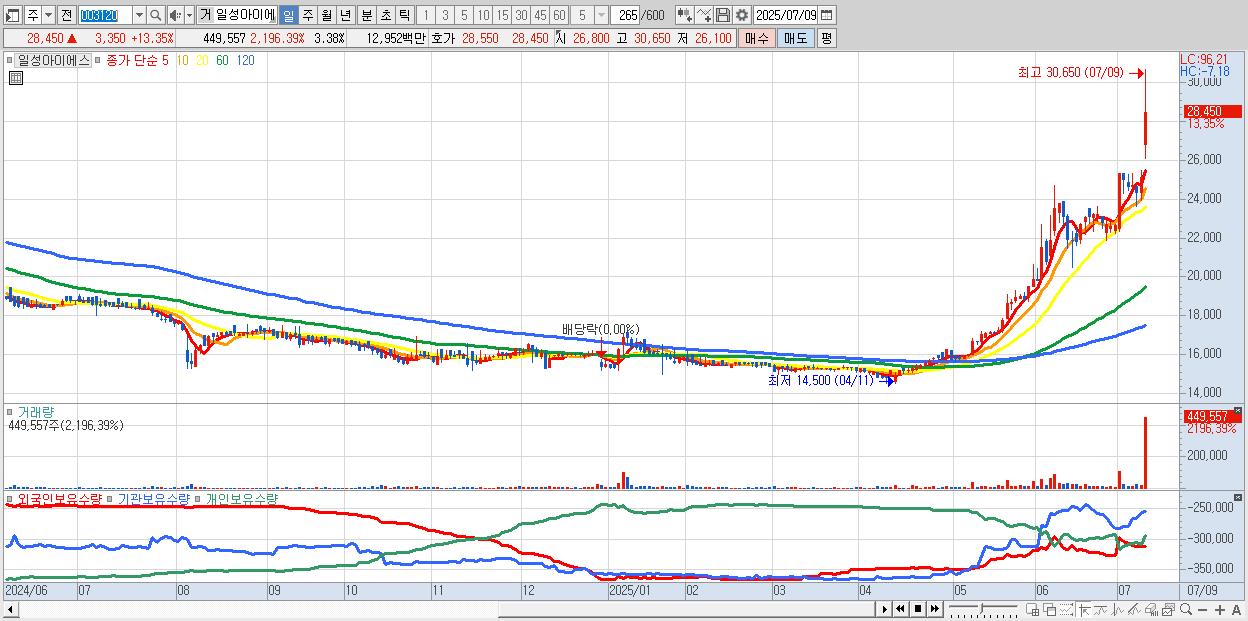 - 일성아이에스 (28,450원 ▲ 13.35% , 시총: 3,784억, 거래량: 449,557, 거래대금:130억, KOSPI)