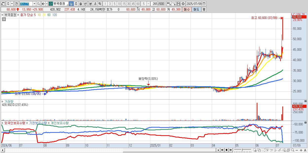 - 부국증권 (60,600원 ▲ 29.9% , 시총: 6,284억, 거래량: 428,902, 거래대금:242억, KOSPI)