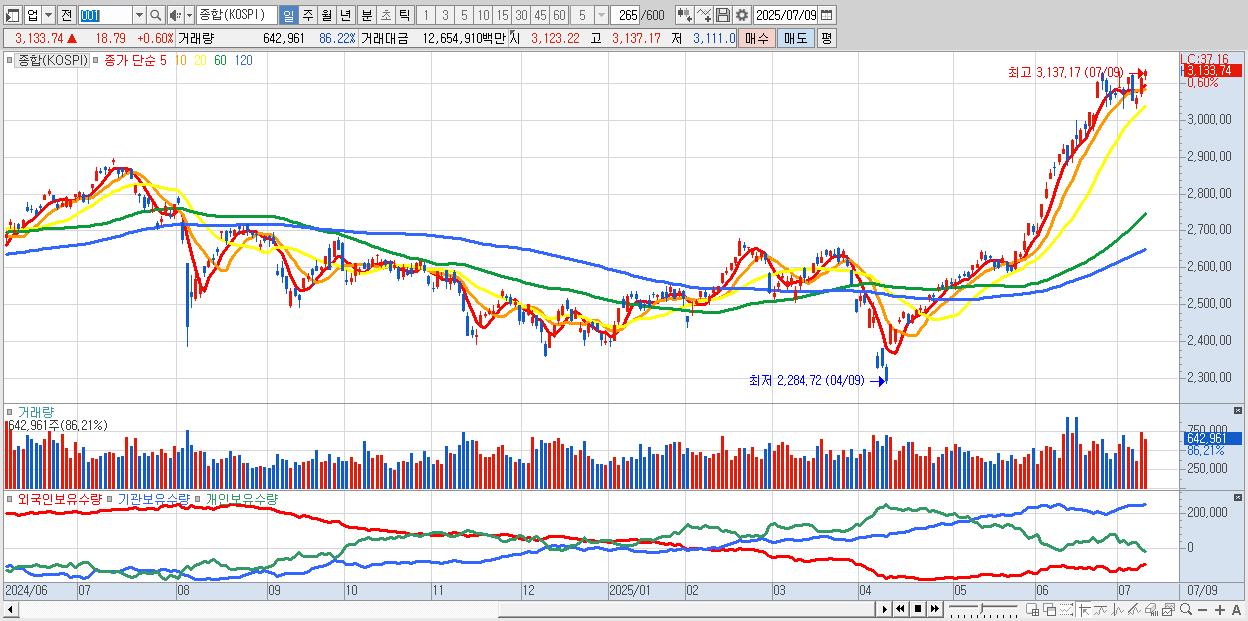 | 07/09 | 3,133.74 | ▲0.60% | 4,310억 | -4,105억 | -571억 | 366억 |