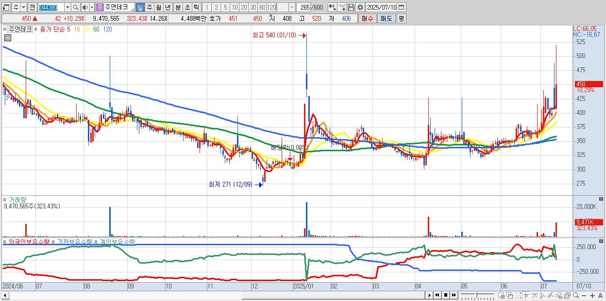 - 주연테크 (450원 ▲ 10.29% , 시총: 299억, 거래량: 9,470,565, 거래대금:45억)