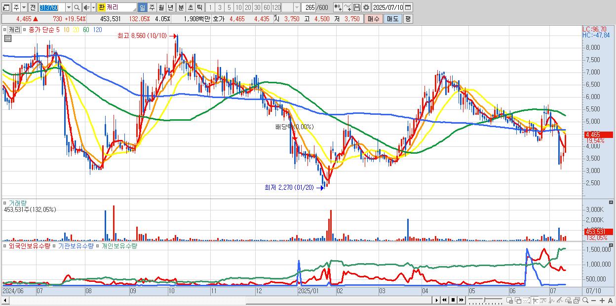 - 캐리 (4,465원 ▲ 19.54% , 시총: 500억, 거래량: 453,531, 거래대금:19억)