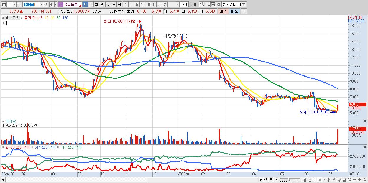 - 넥스트칩 (6,100원 ▲ 15.53% , 시총: 1,103억, 거래량: 1,001,154, 거래대금:59억)