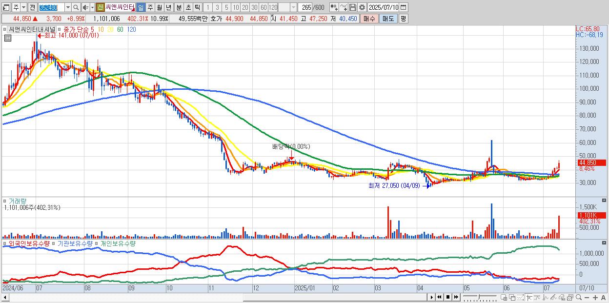 - 씨앤씨인터내셔널 (44,900원 ▲ 9.11% , 시총: 4,496억, 거래량: 749,029, 거래대금:338억)
