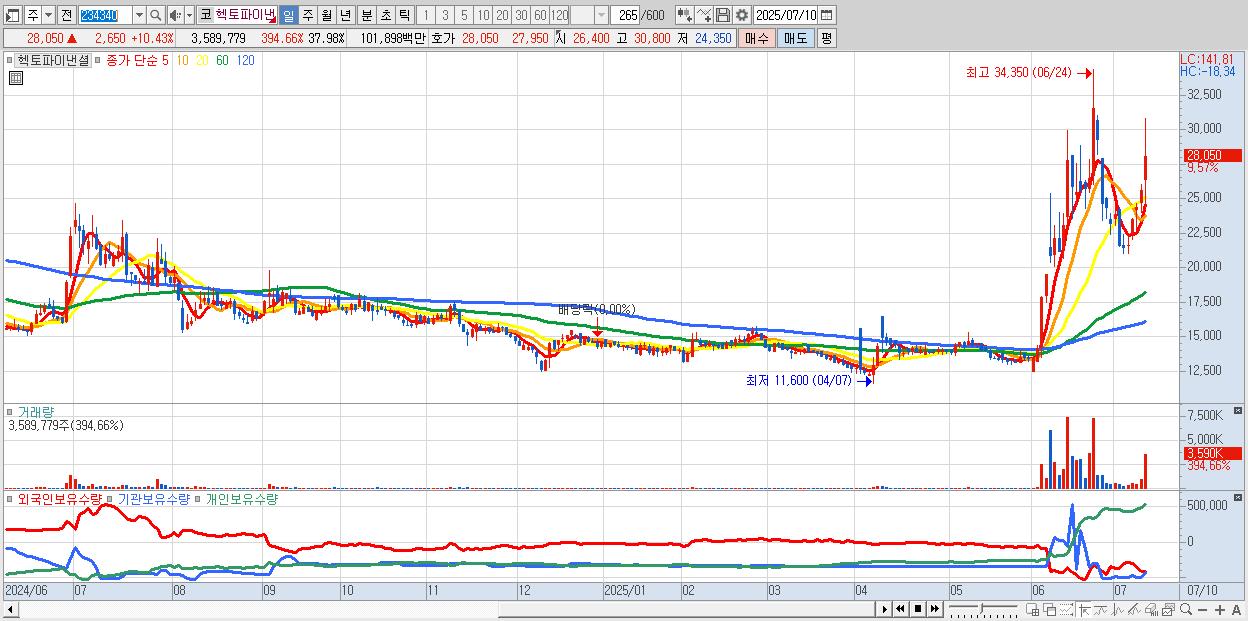 - 헥토파이낸셜 (28,100원 ▲ 10.63% , 시총: 2,656억, 거래량: 1,986,071, 거래대금:564억)