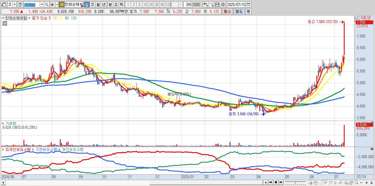- 한화손해보험 (7,080원 ▲ 16.07% , 시총: 8,265억, 거래량: 4,809,660, 거래대금:328억)