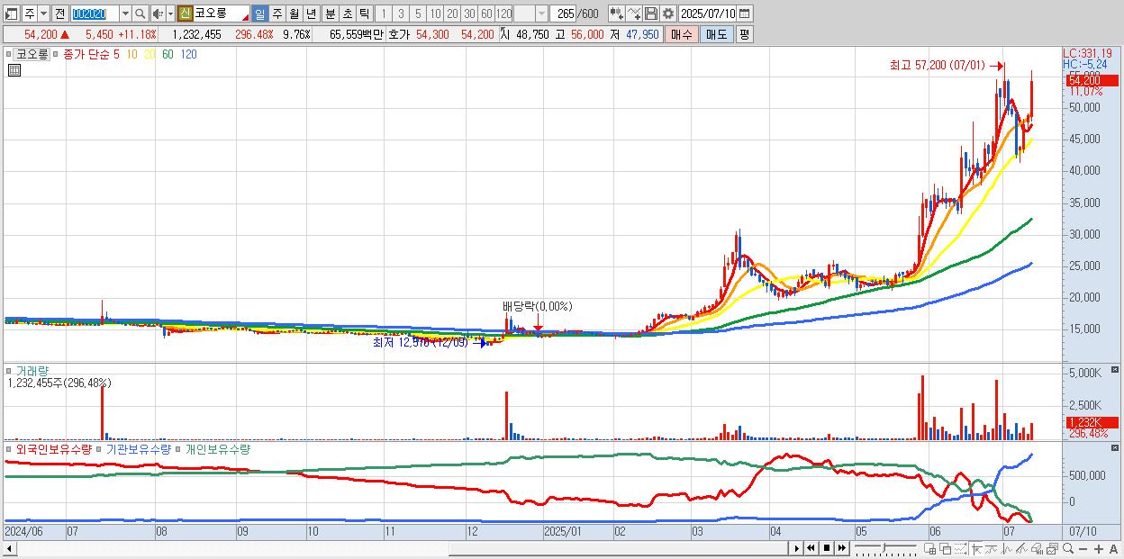 - 코오롱 (54,400원 ▲ 11.59% , 시총: 6,869억, 거래량: 750,528, 거래대금:401억)