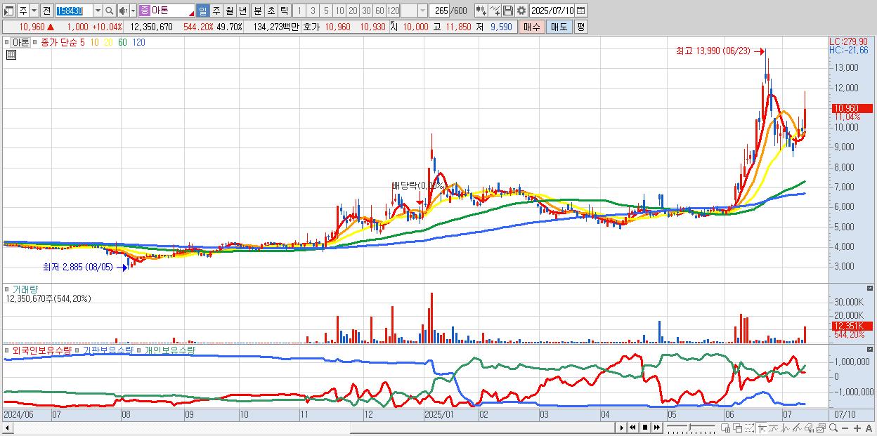 - 아톤 (10,850원 ▲ 8.94% , 시총: 2,696억, 거래량: 7,080,509, 거래대금:770억)