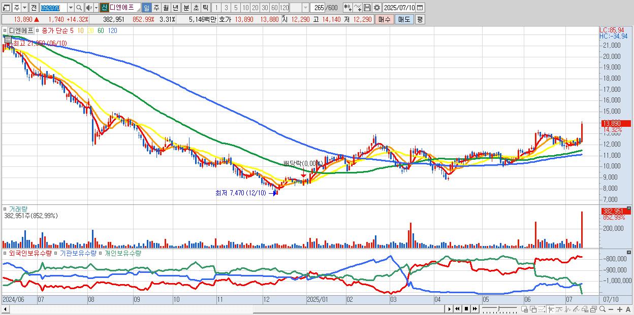 - 디엔에프 (13,890원 ▲ 14.32% , 시총: 1,607억, 거래량: 382,951, 거래대금:51억)