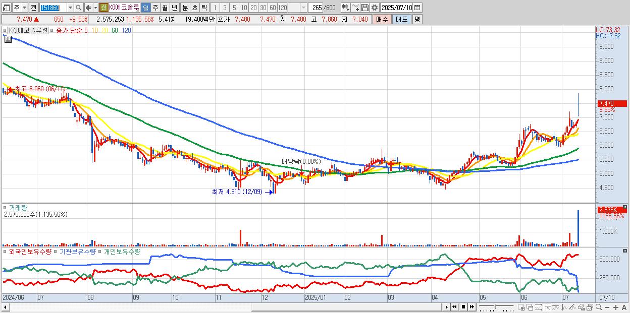 - KG에코솔루션 (7,470원 ▲ 9.53% , 시총: 3,556억, 거래량: 2,575,253, 거래대금:194억)