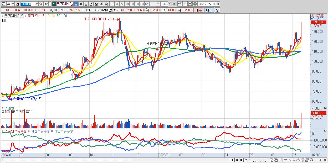 - 리가켐바이오 (141,800원 ▲ 16.9% , 시총: 51,913억, 거래량: 1,822,251, 거래대금:2,456억)