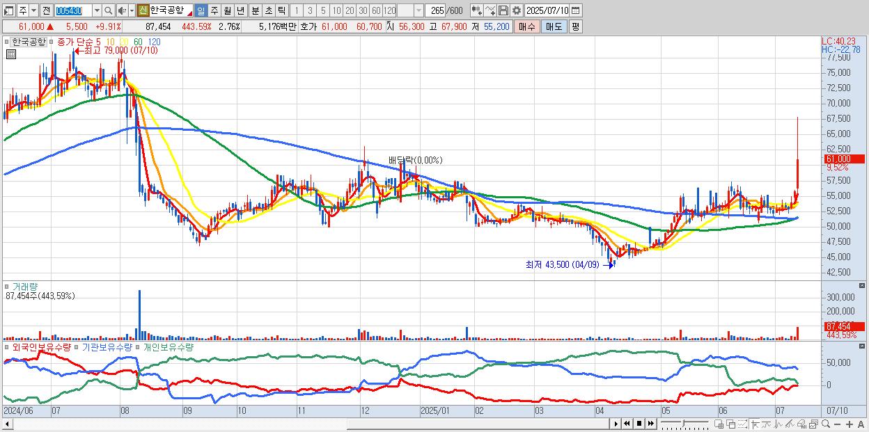 - 한국공항 (60,800원 ▲ 9.55% , 시총: 1,925억, 거래량: 50,388, 거래대금:30억)
