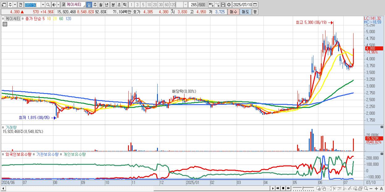 - 케이씨티 (4,380원 ▲ 14.96% , 시총: 751억, 거래량: 15,920,468, 거래대금:711억)