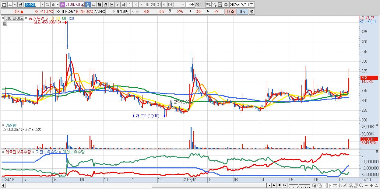 - 케이바이오 (308원 ▲ 14.07% , 시총: 356억, 거래량: 32,003,357, 거래대금:100억)