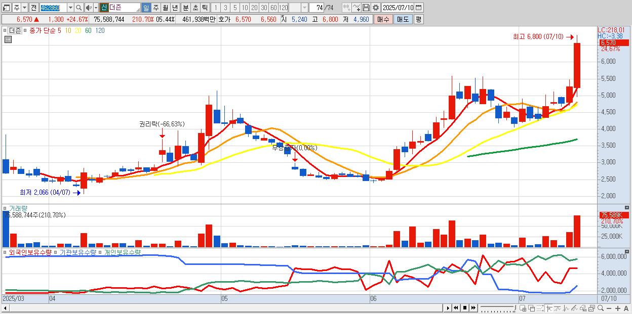 - 더즌 (6,570원 ▲ 24.67% , 시총: 4,710억, 거래량: 75,588,744, 거래대금:4,619억)