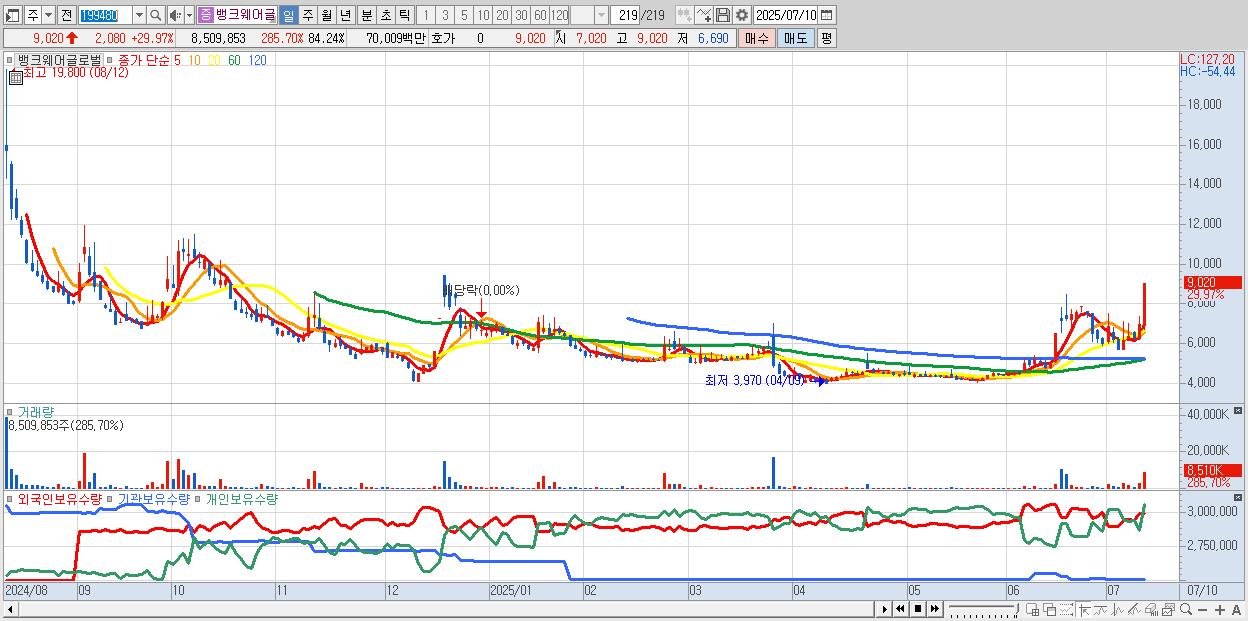 - 뱅크웨어글로벌 (9,020원 ▲ 29.97% , 시총: 911억, 거래량: 8,509,853, 거래대금:700억)