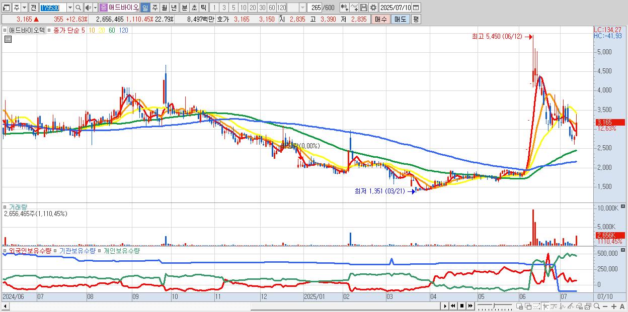- 애드바이오텍 (3,165원 ▲ 12.63% , 시총: 369억, 거래량: 2,656,465, 거래대금:85억)