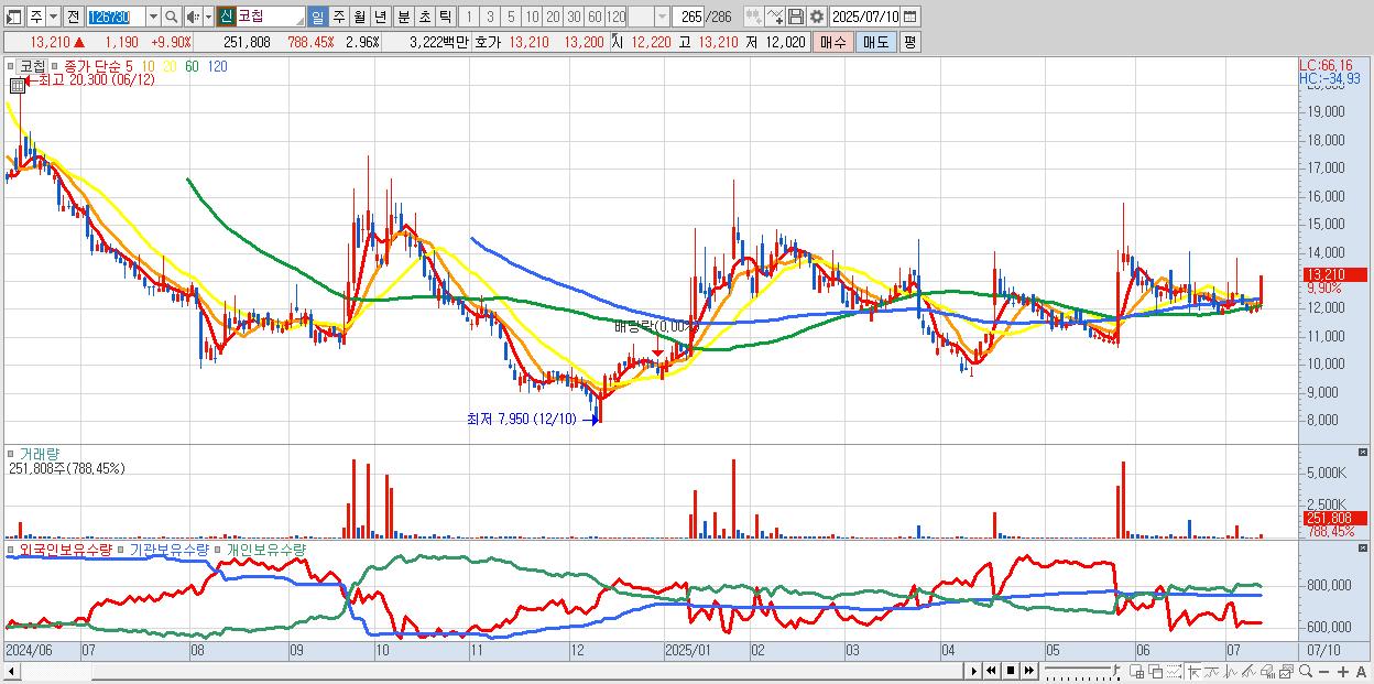 - 코칩 (13,210원 ▲ 9.9% , 시총: 1,123억, 거래량: 251,808, 거래대금:32억)