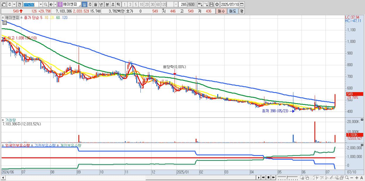 - 에이엔피 (549원 ▲ 29.79% , 시총: 248억, 거래량: 7,103,386, 거래대금:38억)