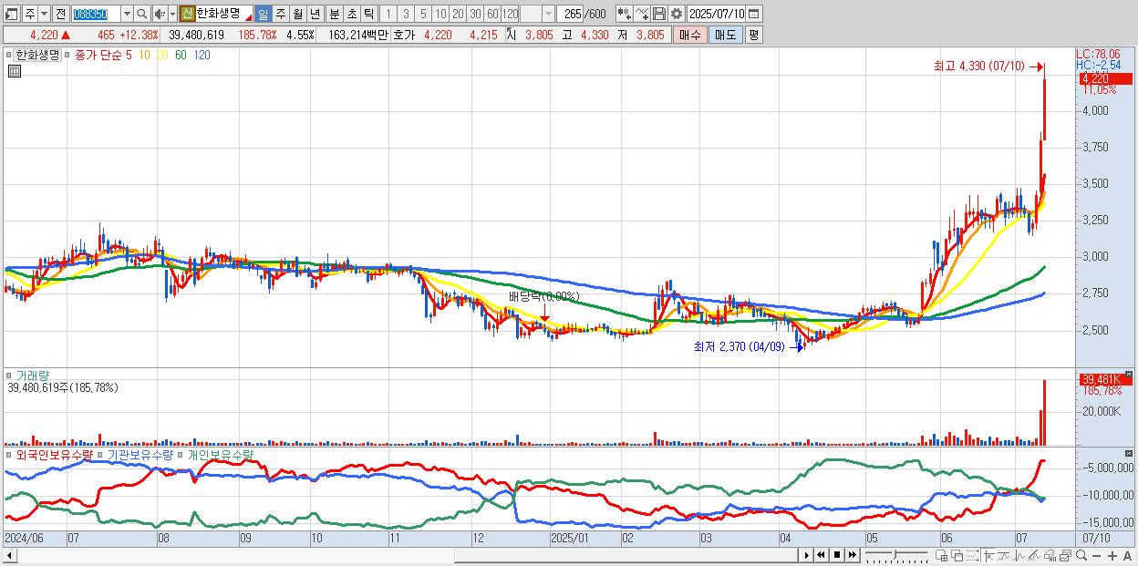 - 한화생명 (4,200원 ▲ 11.85% , 시총: 36,478억, 거래량: 19,970,081, 거래대금:824억)