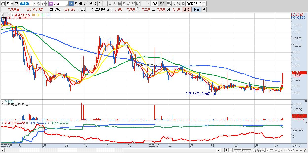 - 야스 (7,980원 ▲ 12.08% , 시총: 1,042억, 거래량: 211,378, 거래대금:16억)