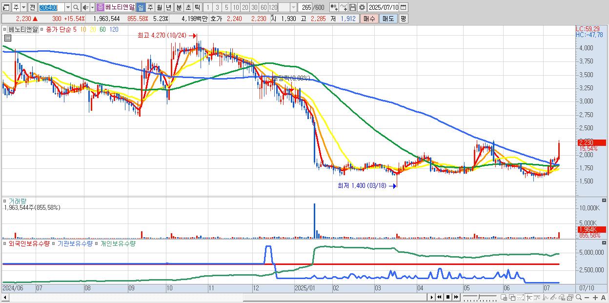 - 베노티앤알 (2,230원 ▲ 15.54% , 시총: 836억, 거래량: 1,963,544, 거래대금:42억)