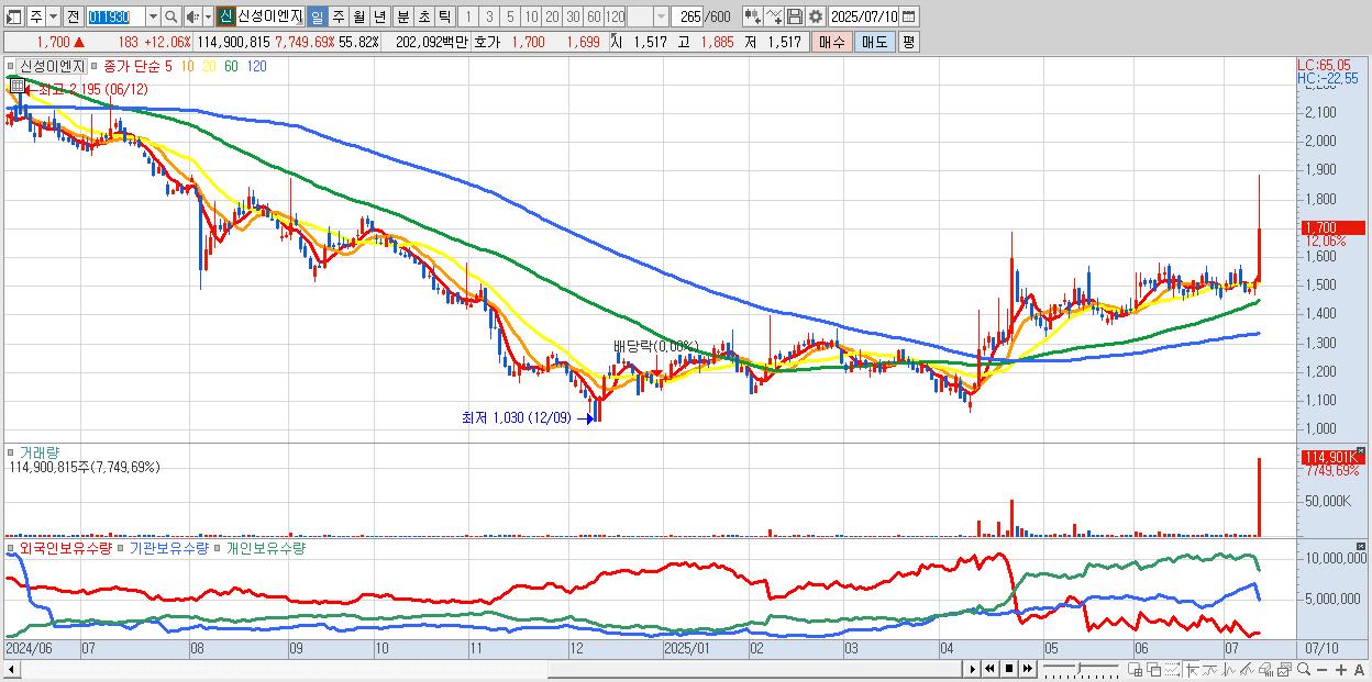 - 신성이엔지 (1,700원 ▲ 12.06% , 시총: 3,499억, 거래량: 114,900,815, 거래대금:2,021억)