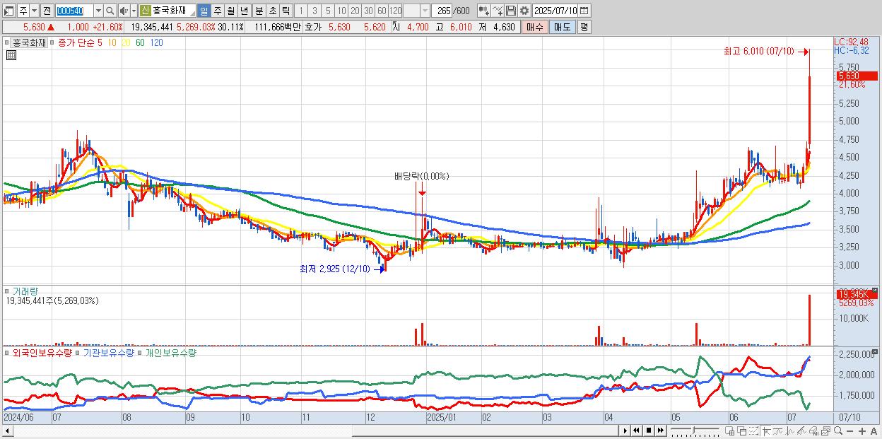 - 흥국화재 (5,630원 ▲ 21.6% , 시총: 3,617억, 거래량: 19,345,441, 거래대금:1,117억, KOSPI)
