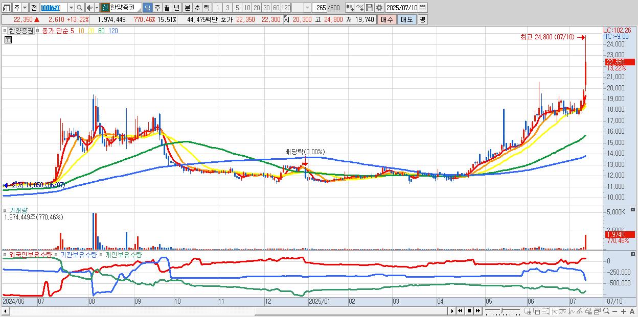 - 한양증권 (22,350원 ▲ 13.22% , 시총: 2,845억, 거래량: 1,974,449, 거래대금:445억, KOSPI)
