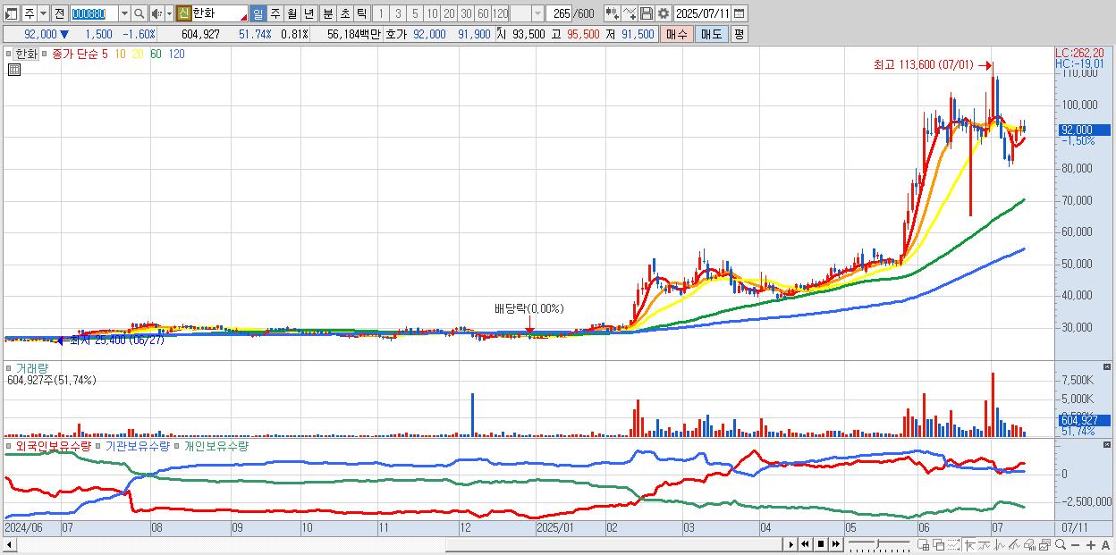 - 한화 (92,100원 ▼ -1.5% , 시총: 69,037억, 외국인 순매수 거래금:93억)
