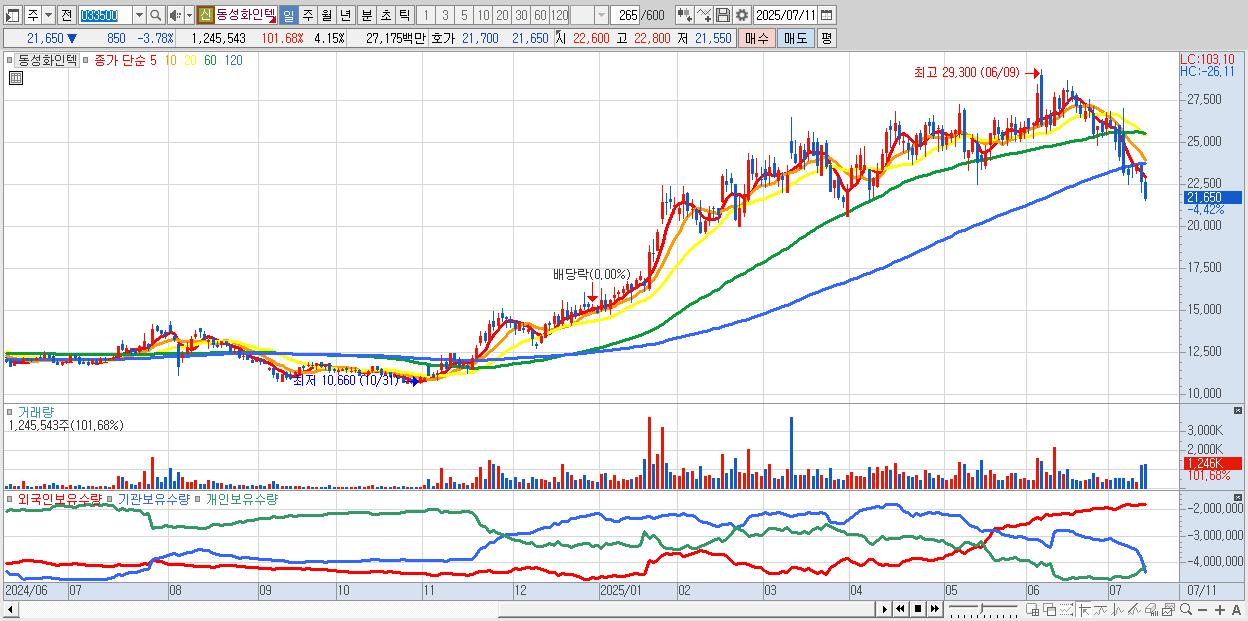 - 동성화인텍 (21,650원 ▼ -3.78% , 시총: 6,493억, 외국인 순매수 거래금:66억)