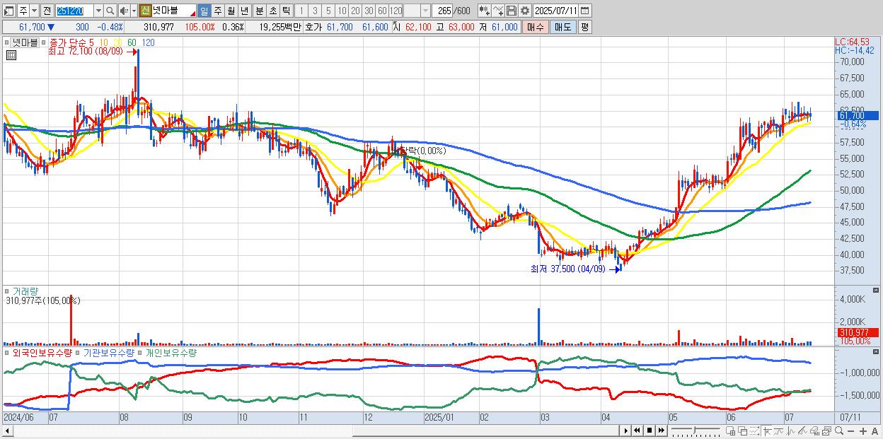 - 넷마블 (61,700원 ▼ -0.48% , 시총: 53,033억, 외국인 순매수 거래금:51억)
