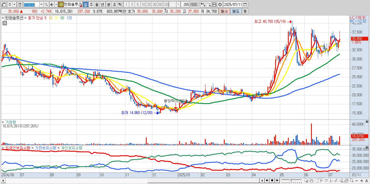 - 한화솔루션 (35,400원 ▲ 2.02% , 시총: 60,850억, 외국인 순매수 거래금:232억)