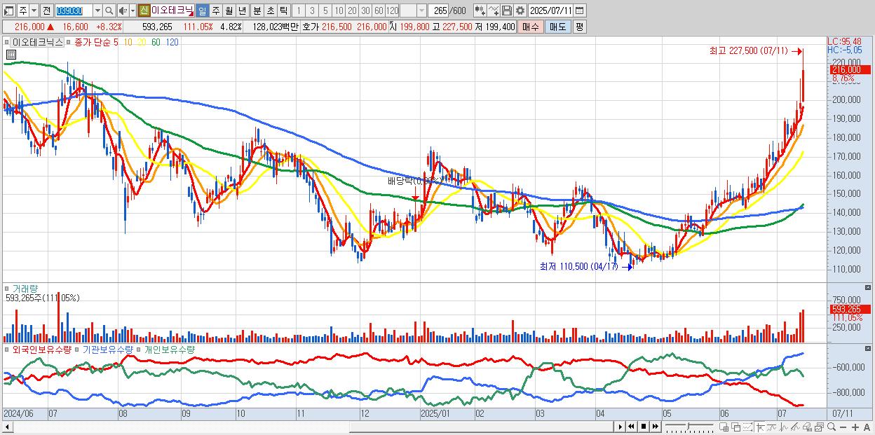 - 이오테크닉스 (214,000원 ▲ 7.32% , 시총: 26,364억, 외국인 순매수 거래금:61억)