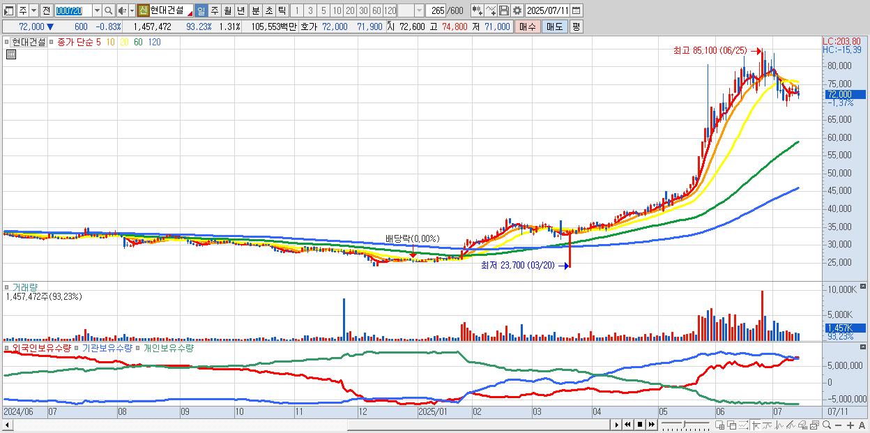 - 현대건설 (72,100원 ▼ -0.69% , 시총: 80,288억, 외국인 순매수 거래금:112억)