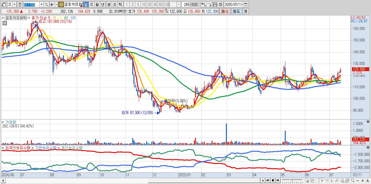- 금호석유화학 (125,700원 ▲ 2.53% , 시총: 33,260억, 외국인 순매수 거래금:45억)